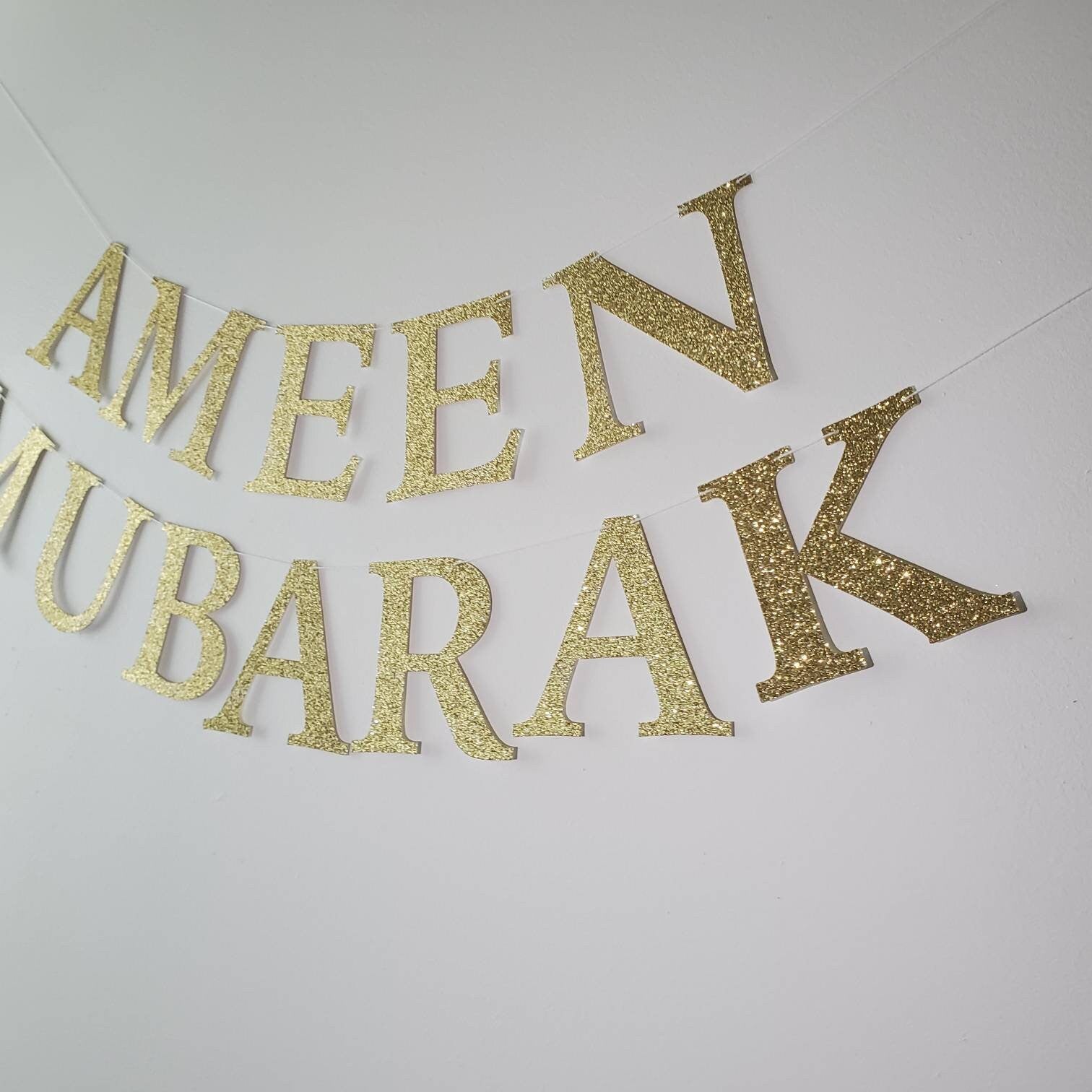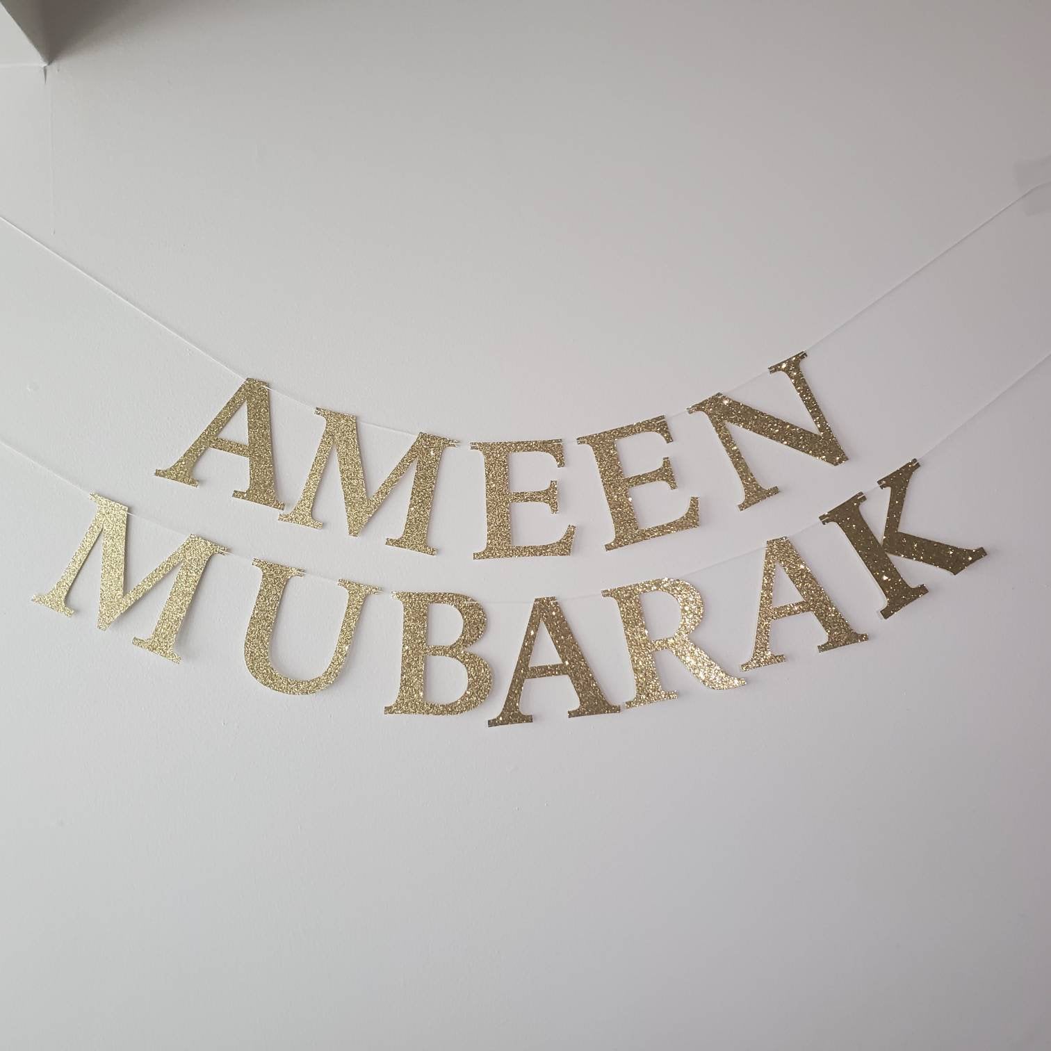 This Ameen Mubarak Banner is made from glitter cardstock and features a height-to-width ratio that ensures each letter measures 4 inches. It is the ideal decoration for any ameen event, providing a formal and professional touch with its factual and informative design.